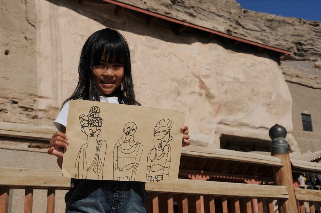 替宣宣導覽講解時,我們也以簡單的語句說明,甚至可以搭配一些相關的小遊戲或活動讓她印象深刻。譬如,我們讓她在出發前可以先畫畫,到石窟現場再比較以前的人和現代人畫畫有什麼不一樣?畫在哪裡?用什麼畫?畫什麼東西?從絲路回台灣後,萱萱對於佛像的特徵到現在都還印象深刻,可以自己畫出佛像呢!