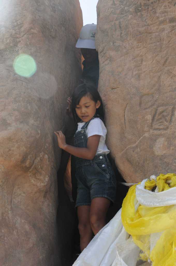 我看到大石頭了!好大好大,而且長的有點像大象,這麼大的石頭被劈開,我看一定又是巨人搞的鬼!這個巨人一定力氣很大,他的劍也一定很大,因為石頭那麼硬,要把石頭切成兩半,好厲害喔!可是如果巨人不小心把劍卡在這個劈劍石裡,怎麼辦呀?