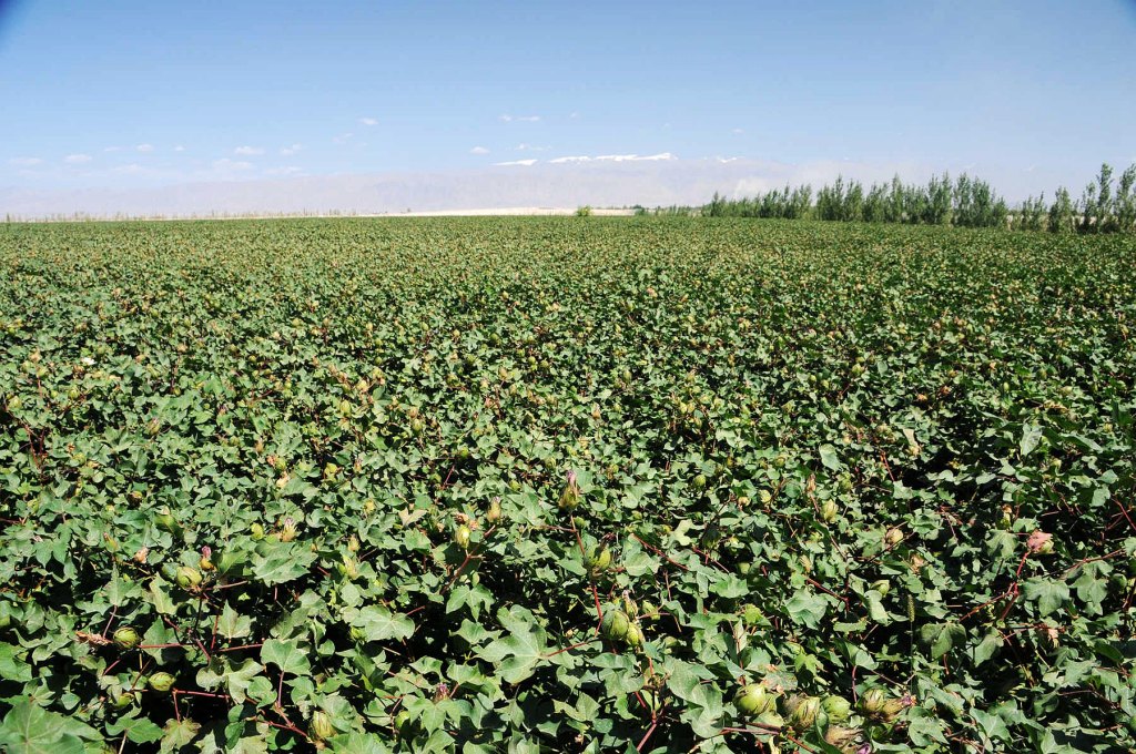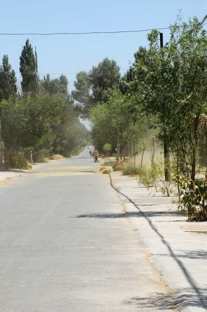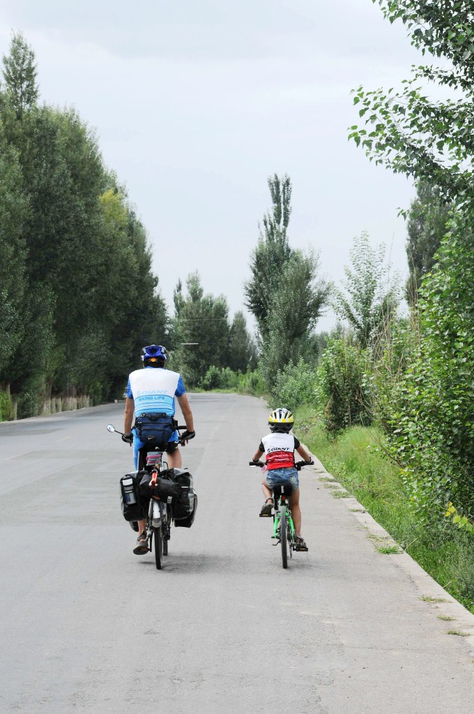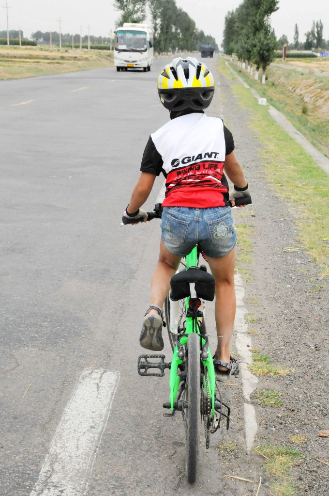 往大泉灣騎進鄉鎮公路,車流一下減少許多,路邊種滿整排的青楊樹及沙枣樹,而旁邊的農地上則是還沒結成棉花的一大片綠色棉花田,如果在9月中旬開花後,將鋪成壯觀的白色地毯,這在台灣都是很少可看到的植物。