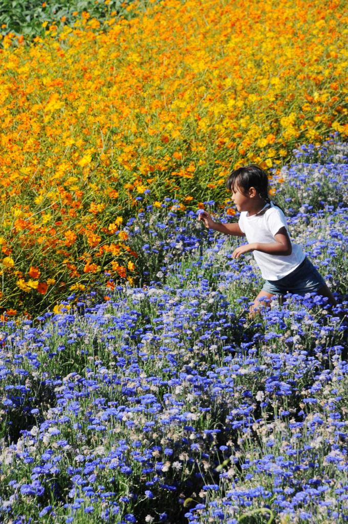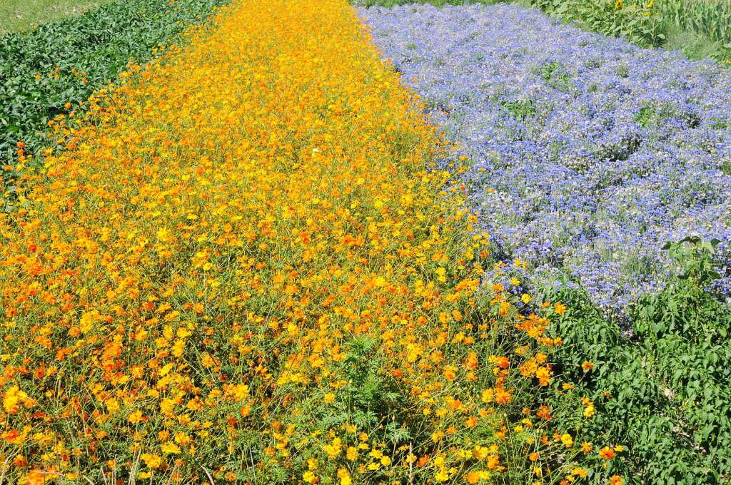 公路旁出現了鮮黃色及紫色的2畦花田,沒想到被戈壁灘包圍的綠洲中還有顏色多彩的春天。