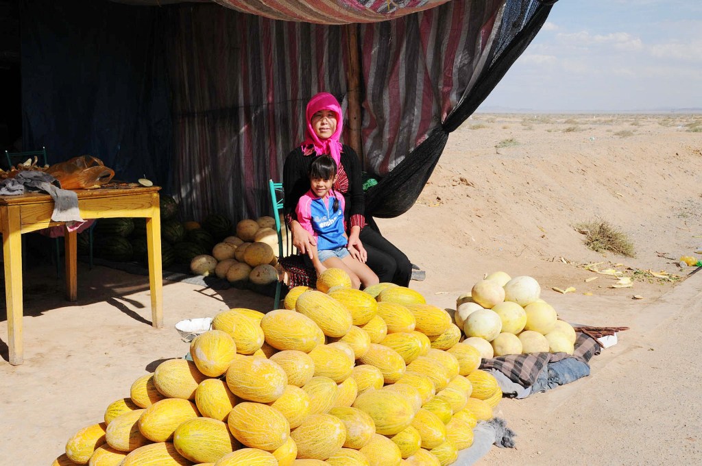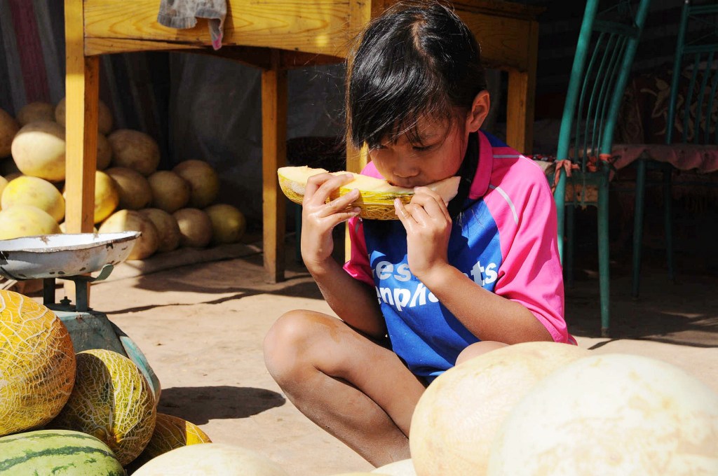照片中的這位太太,已經住在這棚子裡兩個月囉!原來她是從別的鎮上過來的家庭主婦,她所住的鎮上家家戶戶都是種瓜的,如果在那擺瓜攤,競爭太多,於是才會在這公路上擺起攤子,賣瓜給過路來來往往口渴的旅人。她先生每星期會來補貨一次,她已經整整在這瓜攤住了一個多月沒回家了。