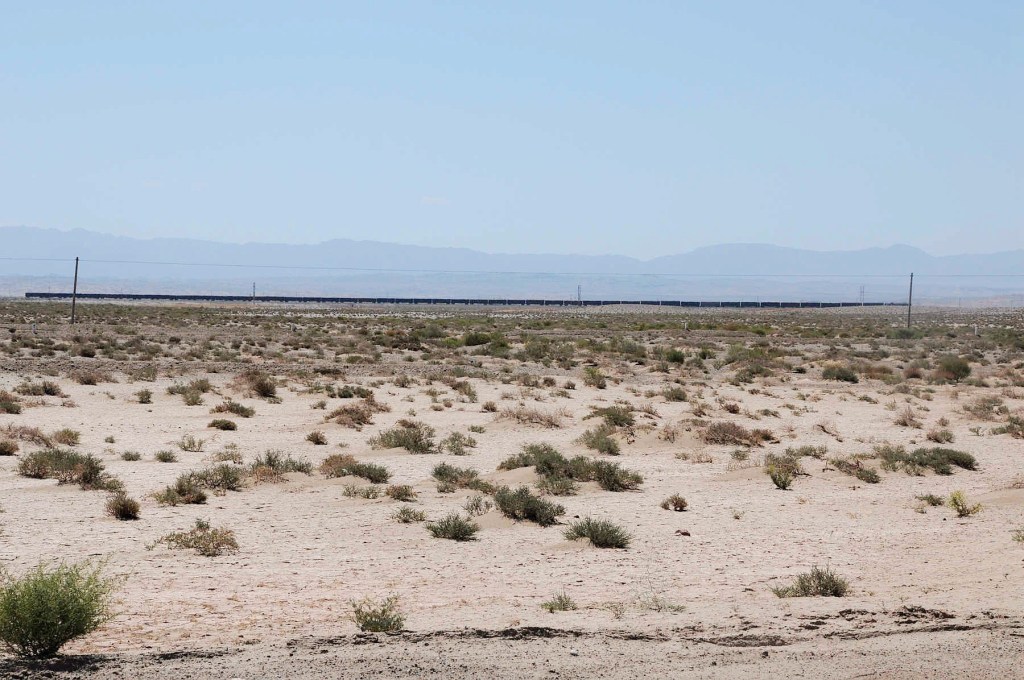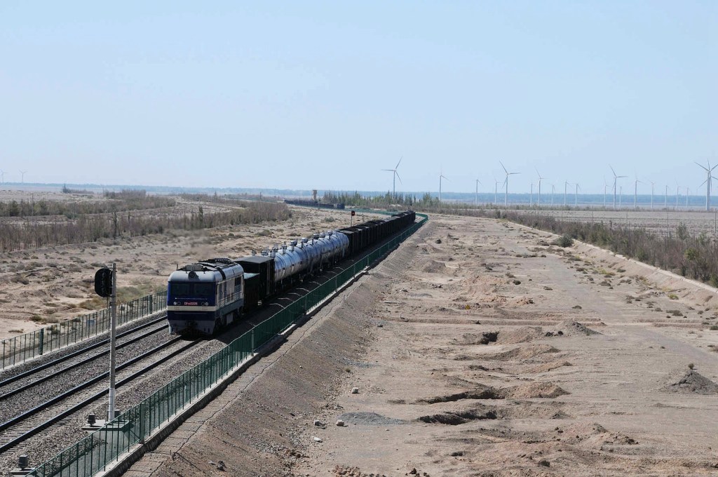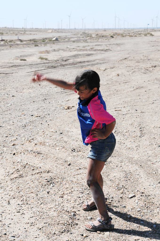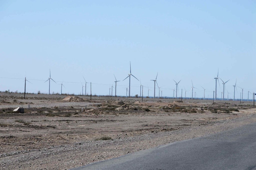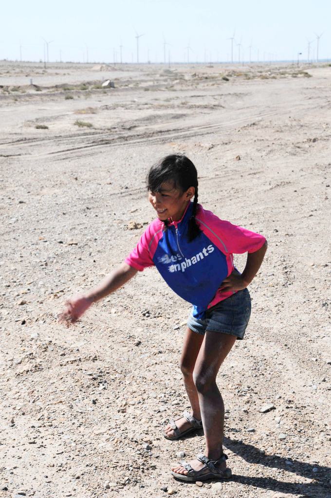 爸:越過鐵路高架橋,站在高處可看到遠處的戈壁灘上,矗立著一排排數量龐多的發電風車,已經進入了玉門的風口地區,一年只颳一次風,從春天到冬天,因此也才能善用戈壁的風,創造出更多的綠色能源。還好今天吹的是東北東風,側順風,如果是逆風,可又要費勁的騎車了。