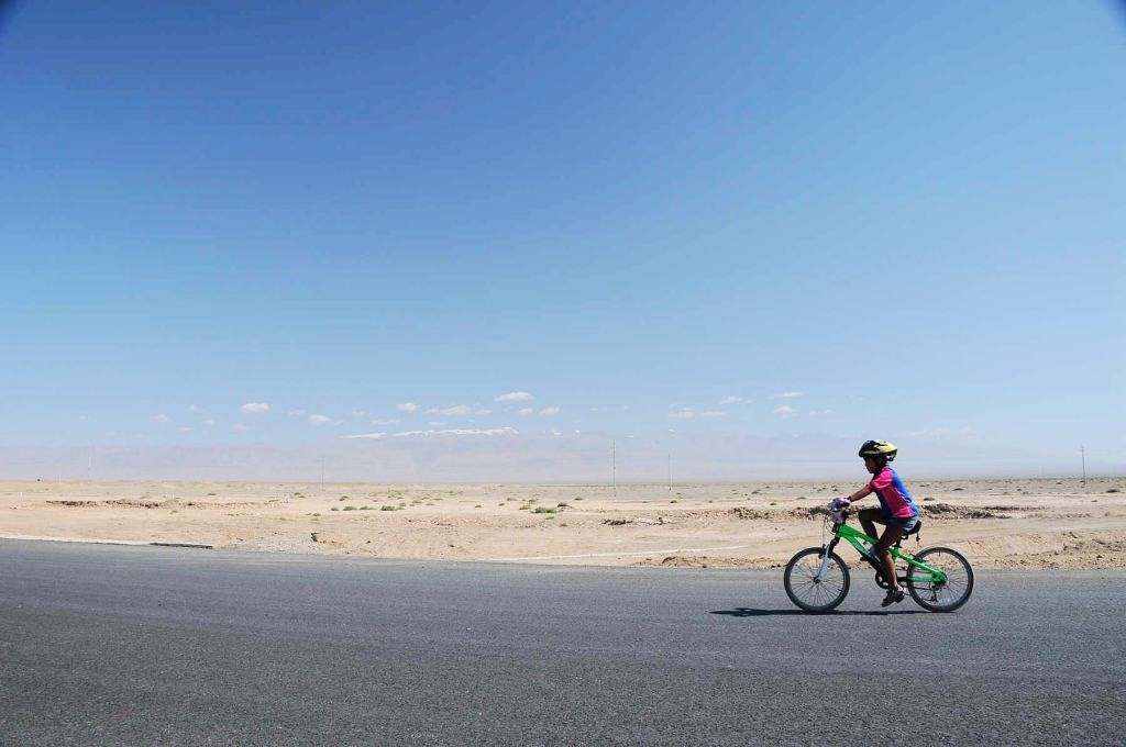 爸:往哈密騎在新路上,北側連綿的是天山山脈,部分山頭上還積著終年不化的白雪,但據當地朋友表示,天山雪山的雪已經比以前少多了,可能也是受到地球暖化的影響。路上由於沒有往來車輛,我們也可以天山山脈為背景,輕鬆的騎乘及拍照。